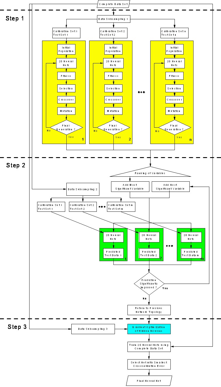 The genetic algorithm framework proposed in this work picks several elements of the studies mentioned above and is presented in the flow diagram in figure 44. The framework can be divided into three steps. The first step consists of multiple parallel runs of the GA presented in section 2.8.9 and in section 7.1 using different calibration and test data subsets (yellow boxes in the flow diagram). Variables, which are represented higher than average in the final population of each GA run, are collected over all GA runs and are ranked according to the frequency of appearance in the final populations. The second step of the framework finally selects the variables in an iterative procedure by adding the variables to the neural network model according to their rank in a stepwise procedure. The neural network is evaluated by the use of different calibration and test data subsets (green boxes in figure 44). The RMSE of prediction of all test data sets is compared with the RMSE of the previous model. If the RMSE is lower (see section 10.2), the last variable is accepted and the procedure is repeated adding the next important variable until the predictions are not improved any more.