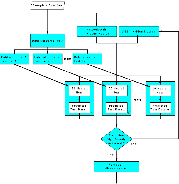 In the third step, the final neural network topology is determined. First, the number of hidden neurons of a single hidden layer is optimized in an iterative procedure, which is shown in figure 45. Starting with fully connected neural networks with 1 hidden neuron additional fully connected neurons are added until the error of prediction of the test data doesn't improve any more, whereby the l different test data subsets are generated by a data subsampling procedure. Finally, this neural network topology is trained with the complete data set several times, and the neural net with the smallest error of crossvalidation should be used as final optimized model and should be validated by an external data set not used during the complete variable selection algorithm.