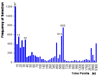 Also, the parallel growing neural network framework introduced in chapter 8 was applied to the data with 500 parallel runs of the growing neural networks for each analyte. The ranking of the variables, which is combined for all analytes similar to section 9.1.2, is shown in figure 66. The second step of the algorithm (20-fold random subsampling sets) stopped after the addition of 5 variables, which are labeled in figure 66. Compared with the variable selection by the GA framework, the selection by the parallel growing network framework looks similar, but not identical. Instead of the signal at 20 s the time point 35 s is used (variation of ethanol and 1-propanol) and instead of the time point 55 s the signal at 650 s is used (main variation of 1-propanol). According to table 6, the corresponding optimized neural networks (4 hidden neurons and 1 output neuron) showed the best predictions of all methods used for this data set.