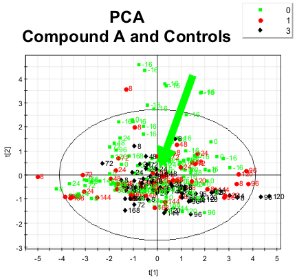 Performing a PCA (principal component analysis) of the spectra is a very common approach for identifying the most significant effects of studies. The figure shows for compound A the scores plot of the PCA of control animals and pre-dosed samples, low-dosed samples and high-dosed samples. The most significant effect, which can be seen, is an adaptation of the animals before dosing (green arrow). No effect related to dosing can be seen. Therefore compound A seems to be clean in terms of metabolic profiles.