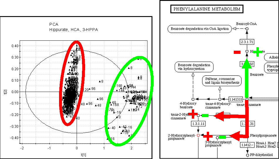 Both, Sprague-Dawley rats and Han Wistar rats show a very intersting phenomenon in the context of metabonomics. Thereby, usually two types types of patterns of metabolites of the phenylalanine metabolism pathway are excreted into urine. These metabolites and changes of the excretion of the metabolites are attributed to the gut microflora and changes of the gut microflora. The concentrations of the corresponding metabolites in urine are rather high. Therefore, changes of the type of gut microflora can dominate the variance of the patterns of metabolites in urine. In the figure both types of gut microflora are shown, which are normal for healthy non treated animals. The first type of gut microflora can be characterized by high levels of Hippurate and low levels of trans-2-Hydroxycinnamate and 3-Hydroxyphenylpropanoate in urine. The second type is characterized by low levels of Hippurate and high levels of trans-2-Hydroxycinnamate and 3-Hydroxyphenlypropanoate in urine. These two profiles are usually exclusive. This means, that an animal shows either the first or the second type of gut microflora. Intermediate concentraton levels of the metabolites are only visible at the moment, when animals switch the typ of gut microflora. It is often visible that Han Wistar animals begin with a low-Hippurate type of gut microflora at the beginning of a study and switch to a high-Hippurate type of gut microflora. The exact relationships and mechanism of the gut microflora, the types of metabolites, the reabsorption of the metabolites in the gut and the importance of the symbiotic system are not known yet, but are of great interest in metabonomics.