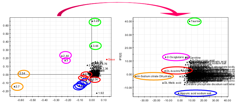 The results of multivariate analyses of sets of spectra (e.g. by PCA or PLS) are scores plots, which represent the relationships of samples, and loadings plots, which represent relationships of signals. Typically the assignment of significantly changed signals to significantly changed metabolites is a tedious manual task. Recently, a new technique has been developed for an easy automated assignment of signals to metabolites (Dieterle, Ross, Schlotterbeck and Senn, Metabolite Projection Analysis). This new technique is a direct extension of common multivariate analyses. The method bases on the projection of spectra of metabolites into multivariate models.