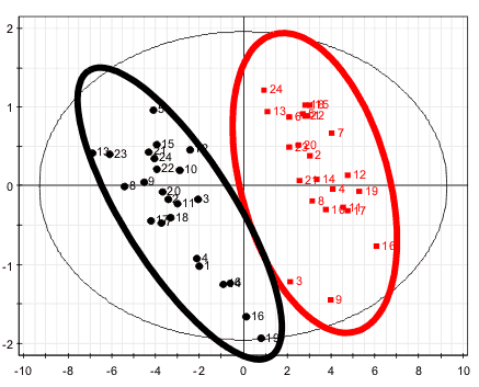 The samples of the ranking study were measured by NMR. The first intersting observation was a 10-fold dilution of post-dosed samples. For NMR measurements, a 10 fold dillution needs a 100-fold measurement time for achieving the same signal to noise ratio. All spectra were analyzed by a PCA. Thereby the spectra clusterd into pre-dose and post-dose samples. As the samples of the control group also clustered into the corresponding groups the separation into these two groups cannot be attributed to a common pharmacological effect. The separation could be traced back to a down-regulation of citrate cycle intermediates for the post-dosed samples. Together with the extreme dilution of the post-dose samples, the origin of this separation could be identified as a 24 hour food restriction before sampling the post-dose samples. A 24 hour food deprivation for rats corresponds to several days fasting of humans massively influencing metabolic profiles. Therefore, only post-dose samples were used for further analyses.